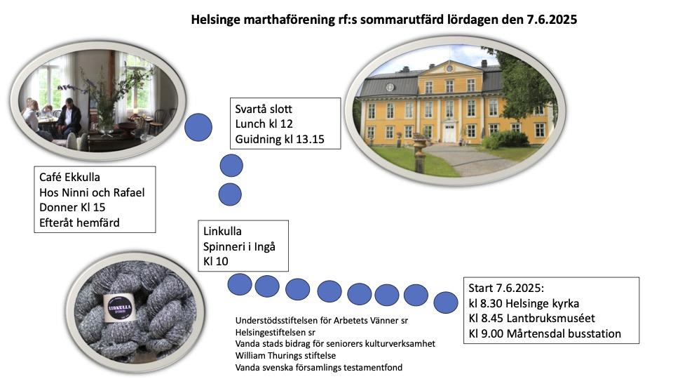 Sommarutfärd 07.06.25 till Svartå med buss från Helsinge Kyrkoby. Vi besöker Linkulla Spinneri, Svartå slott och Ekkulla café.